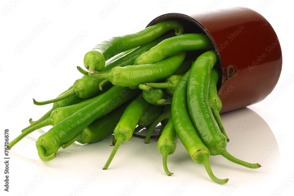 Freshly harvested jalapeno peppers in an enamel cooking pot