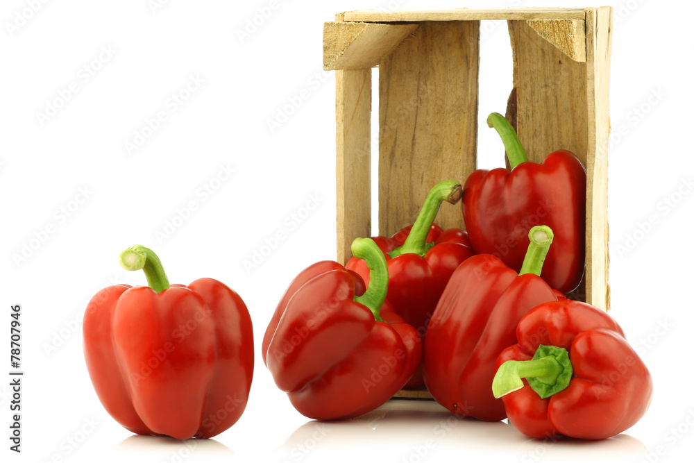 red bell peppers (capsicum) in a wooden crate on a white backgro