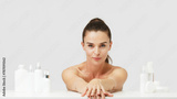 An attractive middle-aged woman next to mock-ups of jars of cream and natural cosmetics. Advertising of spa treatments, anti-aging care products for delicate dry skin.