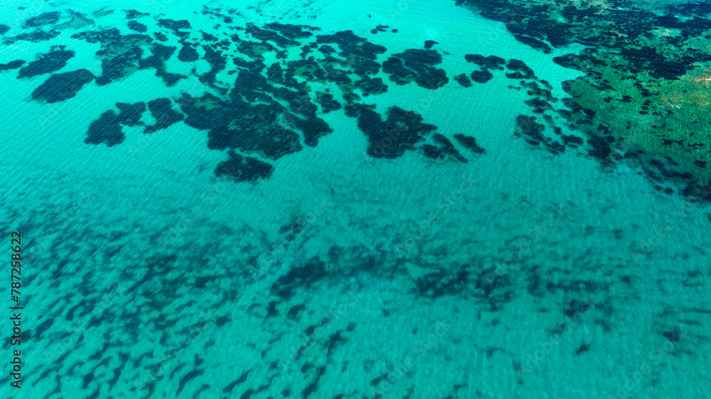 Zenithal view of the clean and crystalline water of the sea of Sardinia, Italy. There are rocks and reefs under the waves. The water surface is calm. Ideal for texture and pattern.