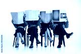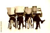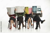 Group of four people, men and women in retro-style clothes sitting on chair and reading newspapers, journals on white background. Concept of retro and vintage, fashion,