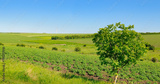 Green potato field and blue sky. Wide photo.