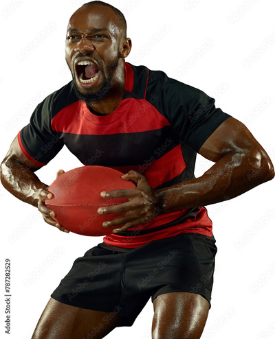 Professional male rugby player, African-American athlete showing motivation, emotions of win isolated on transparent background. Concept of sport, active and healthy lifestyle, action