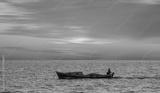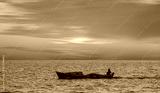 A fisherman departs Alanya Harbor on the Mediterranean sea in Alanya peninsula in the background at dusk - Alanya, Turkey
