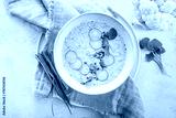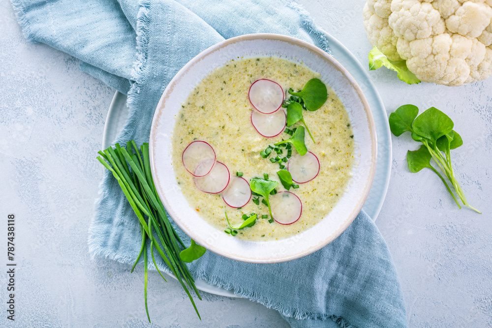 Creamy white cauliflower soup with radish and chives, healthy food with herbs