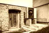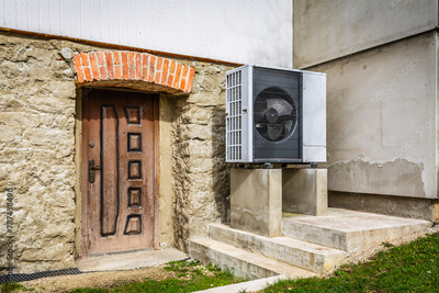 Air source heat pump installed outside of old renovated house, green renewable energy concept of heat pump