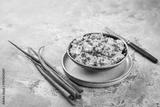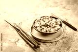 Egg spread with green onions and curry on grey background