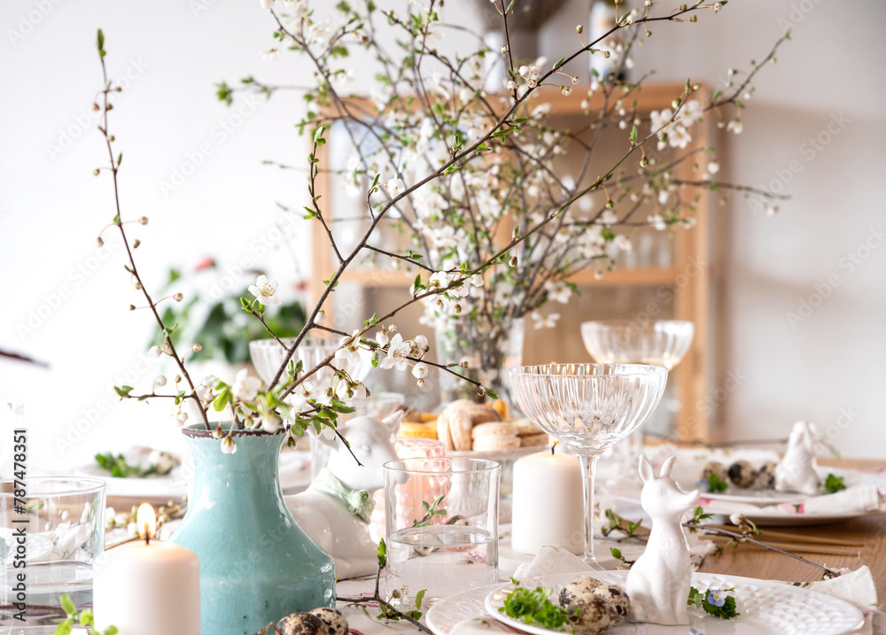 Spring Easter decor. Easter table setting. Flowers and dishes and candles for a festive dinner.