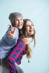 Beste Freundin wird Huckepack getragen und macht Victory Zeichen