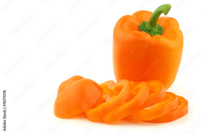 fresh orange bell pepper and a cut one on a white background