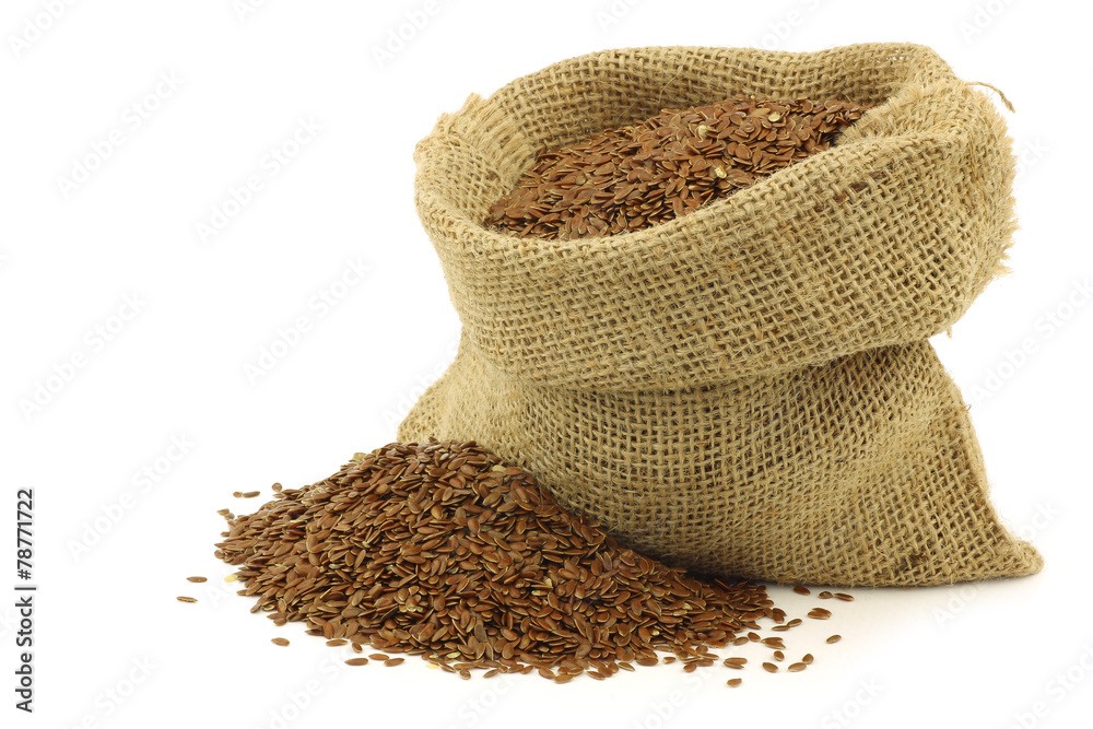 Flax seed (linseed) in a burlap bag on a white background