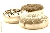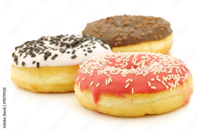 assorted colorful glazed donuts with sprinkles on a white backgr