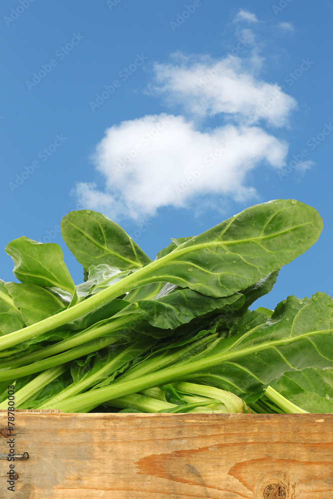 chinese spinach (Ipomoea aquatica) in a wooden crate