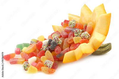 An orange Halloween pumpkin cut open and filled with candy
