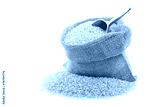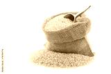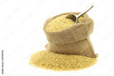 ulgur (couscous) in a burlap bag with an aluminum scoop on a wh