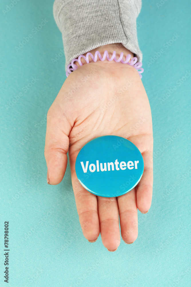 Round volunteer button in hand on colorful background