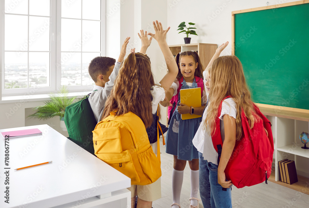 Small group of happy cheerful school children with colorful backpacks standing in a modern classroom and giving each other high five. Back to school, education, success, teamwork concepts