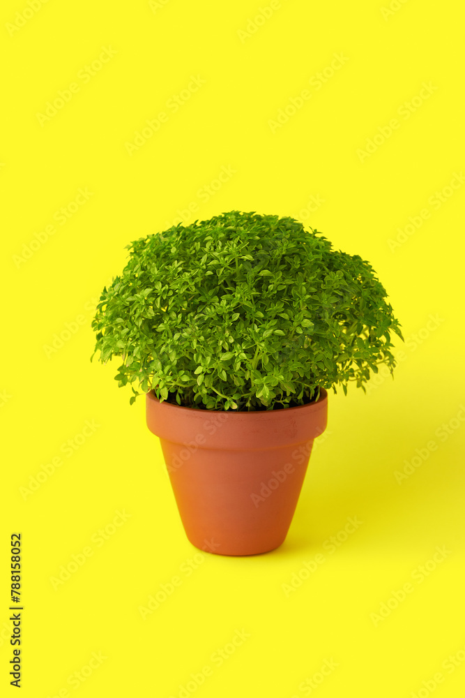 Manjerico potted plant on yellow background. Traditional decor for festival San Juan