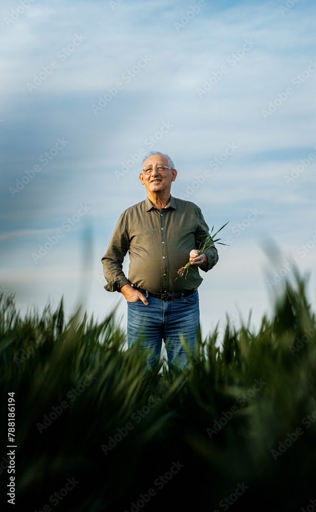 Portrait of senior farmer standing in wheat field holding crop in his hand.