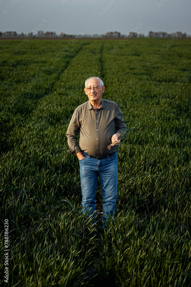 Portrait of senior farmer standing in wheat field holding crop in his hand.
