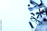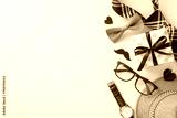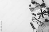Festive composition for Fathers' Day with straw hat, elegant necktie, bow tie, gift box, glasses, mustache, wristwatch on pastel beige. Suitable for greetings or ads. Top view with space for message