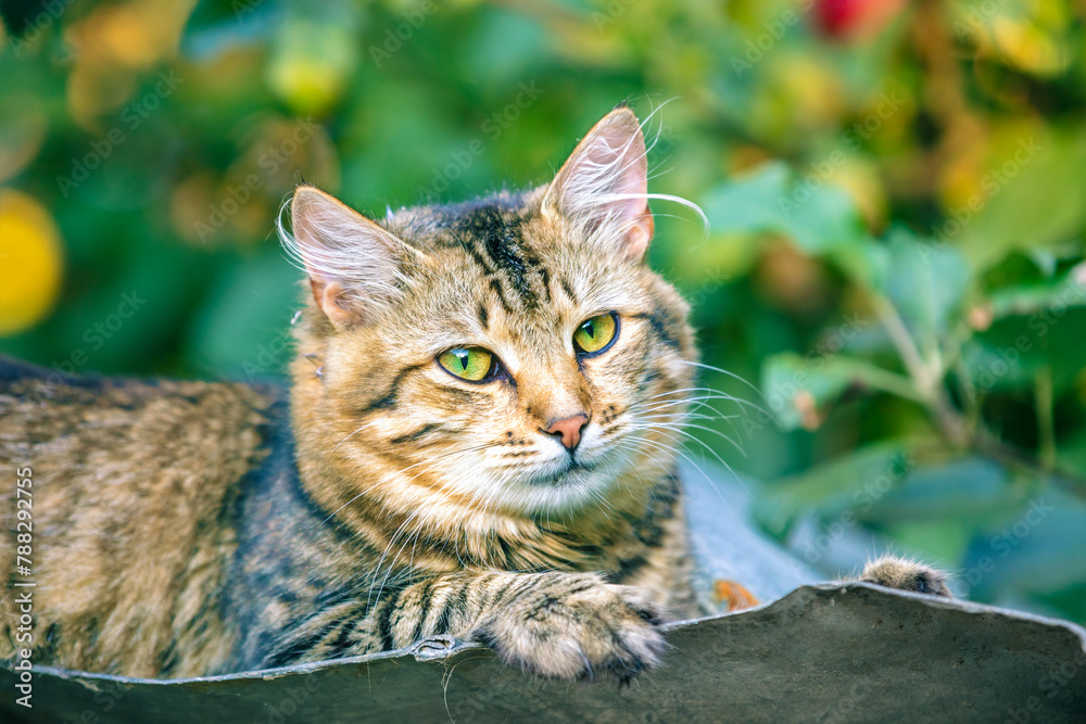 Cute cat lies on the roof of a barn in the autumn garden