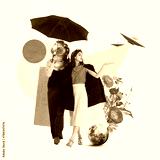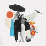 Cosmic journey. Surreal art collage with woman walking hand in hand with man wearing astronaut mask under umbrella. Dreamy fantastic atmosphere. Concept of creativity, retro style, imagination