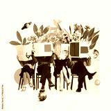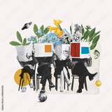 People sitting on chair with head covered with journals and newspapers, reading over floral background. Contemporary art collage. Surrealism, creativity, retro style, imagination, inspiration concept