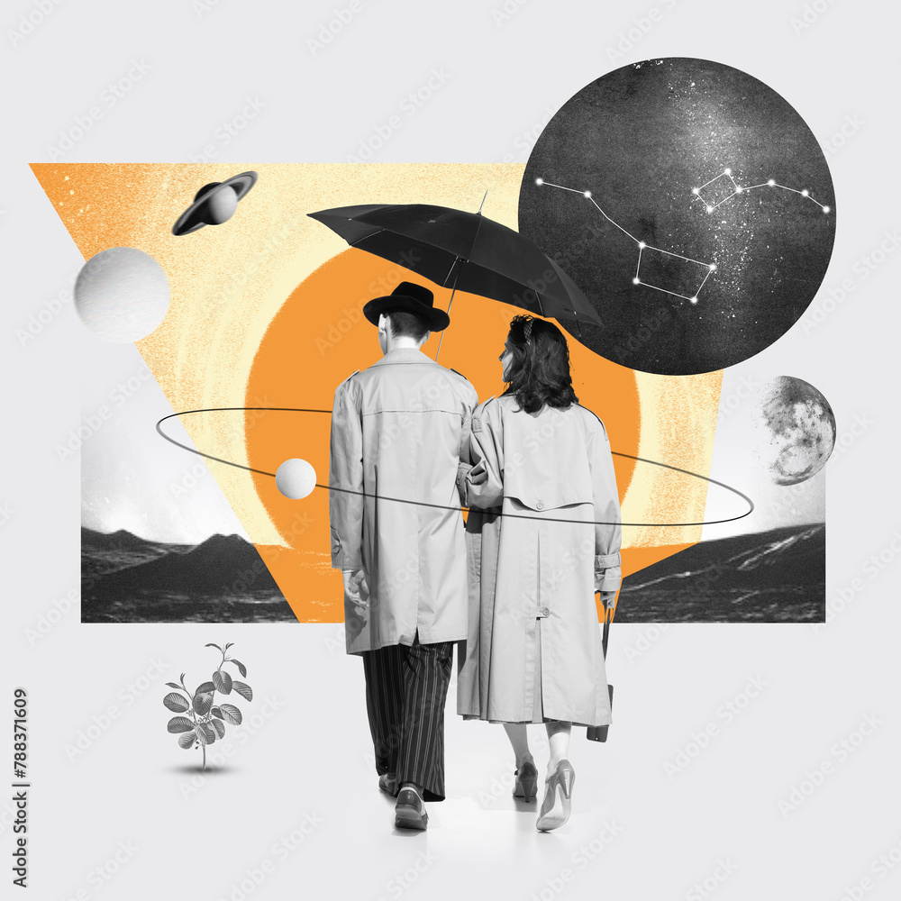 Monochrome image of man and woman walking under umbrella id direction to colorful abstract elements of space, planets. Contemporary artwork. Concept of surrealism, creativity, retro style, imagination