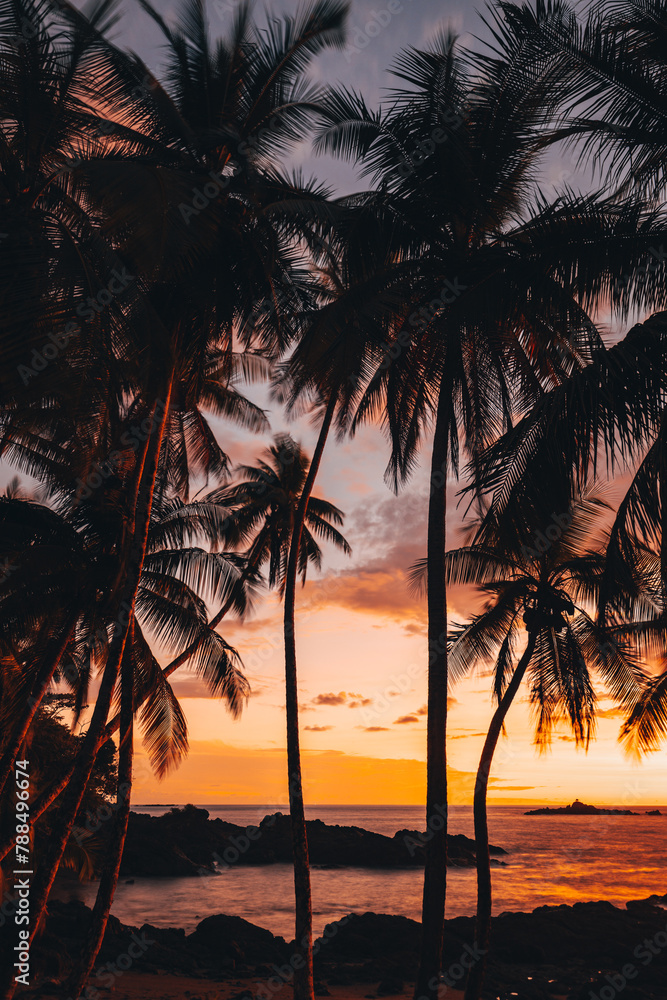 The sun setting on the horizon, palm trees and the beach, vertical view