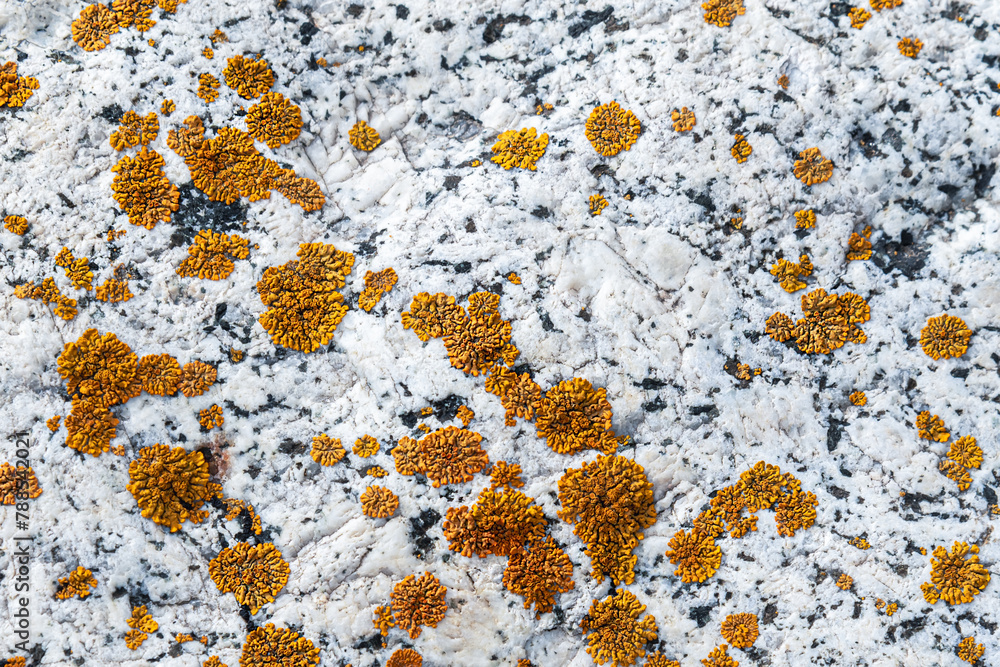 Red moss on the surface of a gray stone. Natural stone background.
