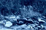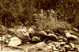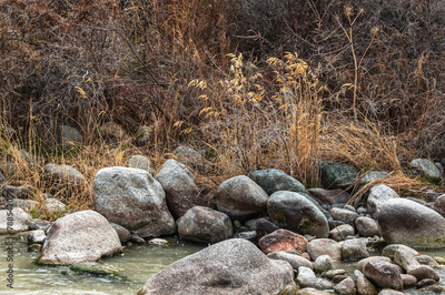 Brown dried grass and huge boulders on the bank of a mountain river. Natural warm background.