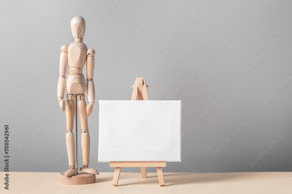 Creative composition with a miniature canvas on an easel and a wooden figurine of a man. Artistic creativity concept