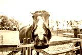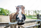 Brown Lusitano horse mare in paddock paradise weird wide angle nose