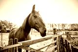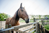 Brown Lusitano horse mare in paddock paradise
