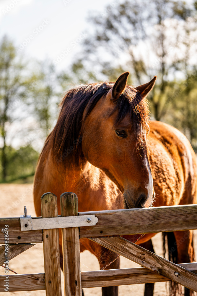Brown Lusitano horse mare in paddock paradise