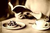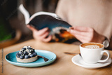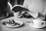 A woman relishes a tranquil moment, engrossed in a book while savoring a blueberry tart and coffee. The scene exudes relaxation and leisure, a delightful blend of literature and culinary indulgence.