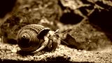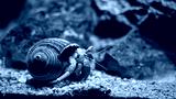 Cute crab with shell and pink legs walking on the sand inside a fish tank