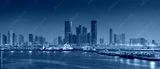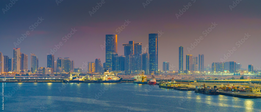 Abu Dhabi, United Arab Emirates - Jan 10 2024, Panoramic view of skyscrapers cityscape with illuminations and street lights on, at sunset, evening, Abu Dhabi, United Arab Emirates