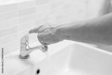 Save water. Man keeps turning off the running water in the bathroom to protect environment. Greening planet, reduce global warming, Save world, life, future, risk energy, crisis , water day.