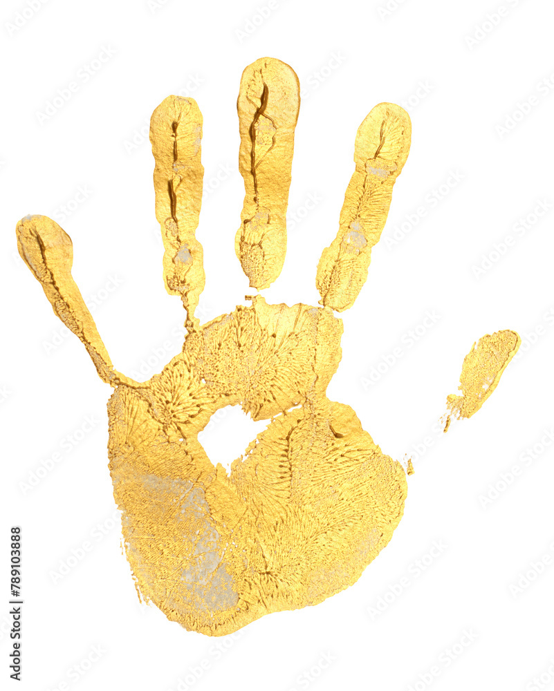 Gold paint handprint on white, expressive for identity and individuality.