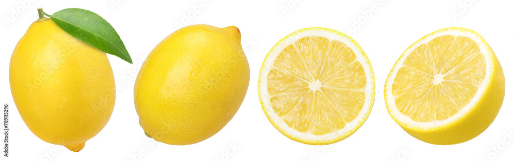 lemon fruit with leaves, slice and half isolated, Fresh and Juicy Lemon, transparent PNG, PNG format, cut out