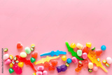 Flat lay of colorful candies and lollipop. Sweet food and candies background