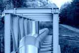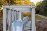 Część rurociągu ciepłej wody. Rura jest izolowana i zabezpieczona blachą i jest układana nad kanałem. Rurociąg z ciepłą wodą na konstrukcji stalowej nad kanałem, widoczny na tle jesiennego lasu.