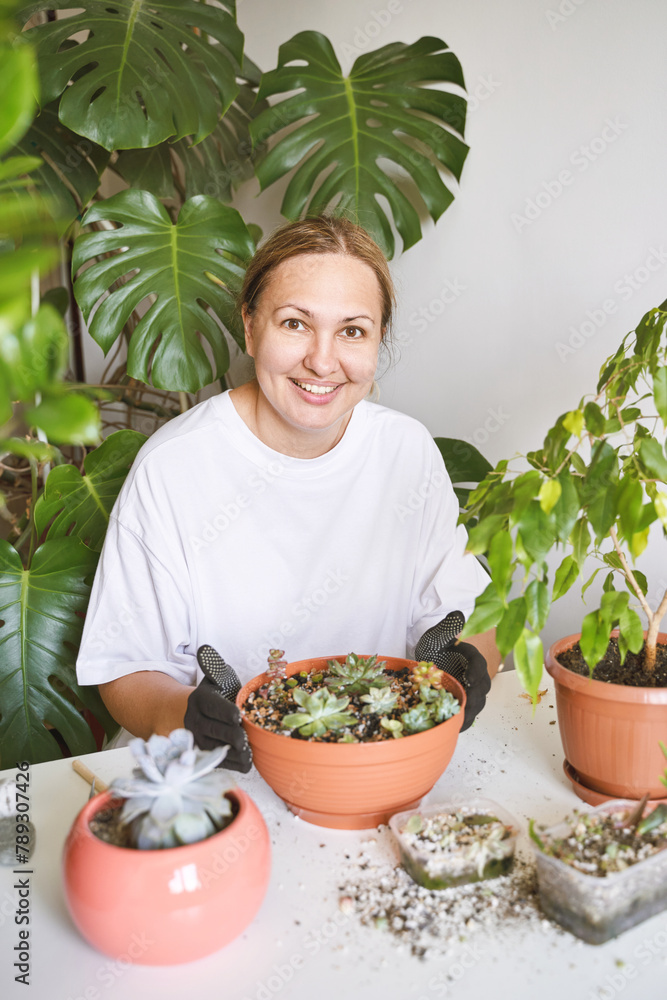 In a cozy room, a smiling woman tends to her beloved plants with care, creating a green oasis in her home. Her happy demeanor reflects her love for gardening, making balcony a cheerful haven