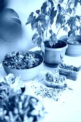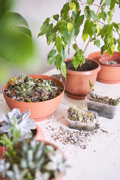 A hand tends to a young echeveria in a decorative pot, indoors. Greenery enlivens the room, a blend of nature and modern decor