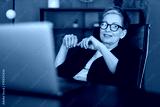 A professional businesswoman, smiling, works on her laptop in a modern office, embracing success and positivity.
