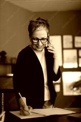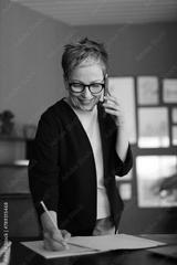A mature businesswoman engages in a conversation over the phone, radiating confidence and professionalism.