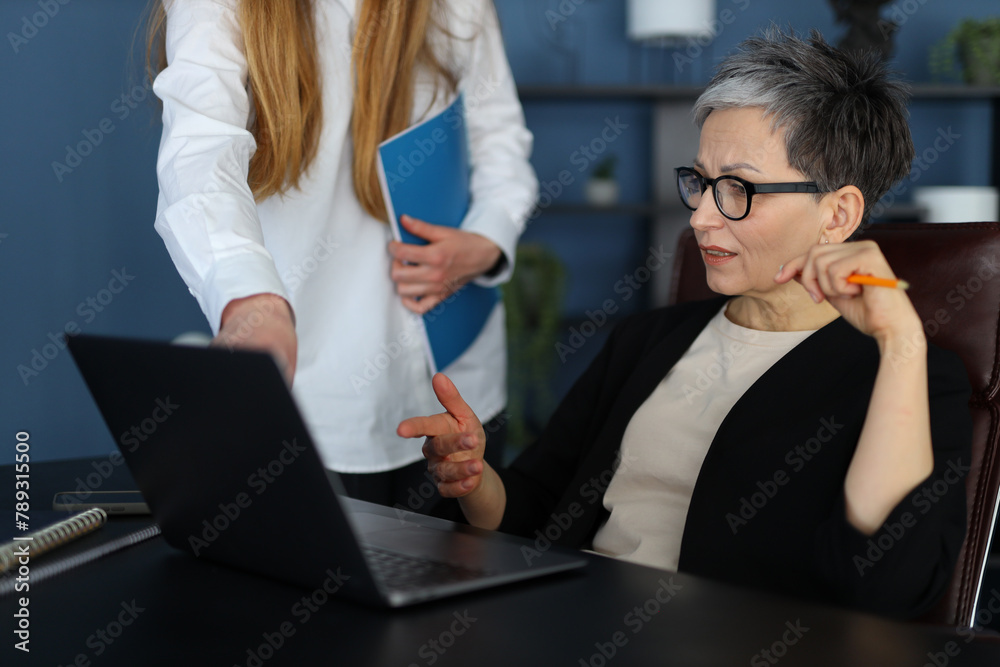 An entrepreneurial businesswoman tackles laptop problems efficiently, utilizing technology for corporate success and professionalism.