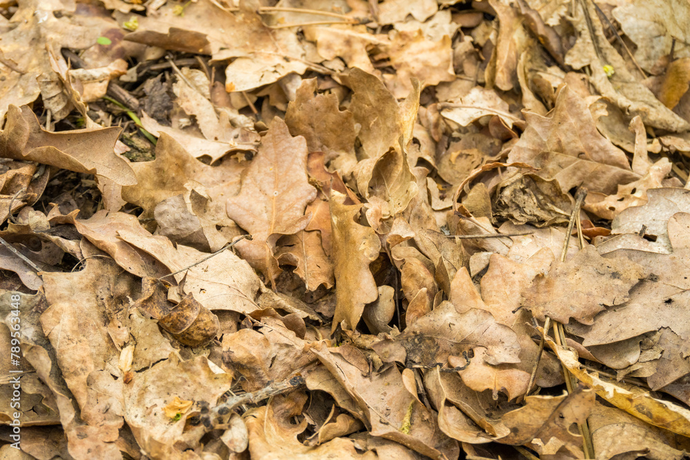 Dry leaf litter or organic waste from fallen leaves on the ground during summer